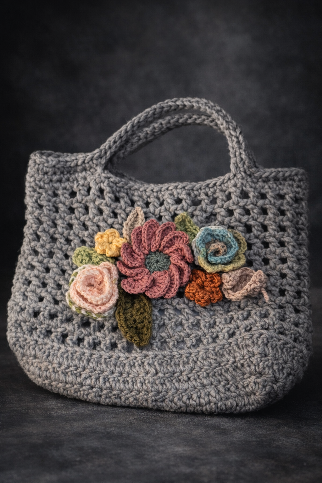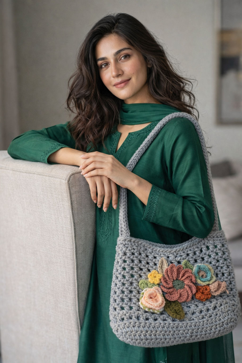 The front of the bag is decorated with lovely multicolor crochet flower appliqué that adds a graceful and artistic look. This floral arrangement enhances the bag’s handmade appeal and gives it a unique, eye-catching finish.