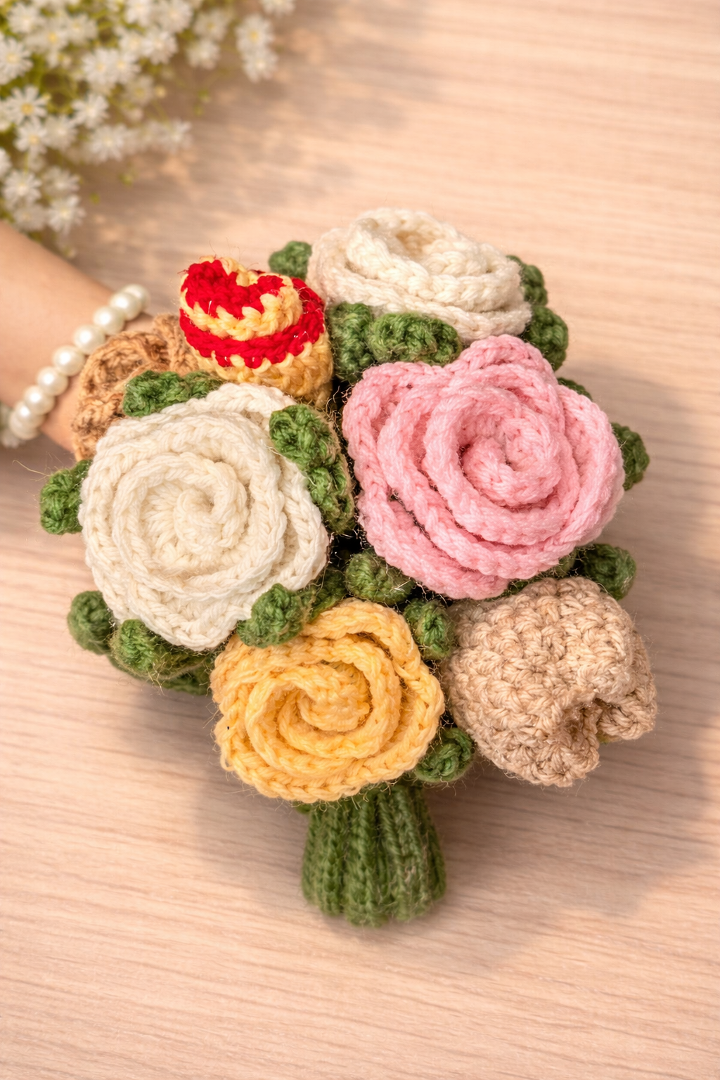 Unlike fresh flowers, this crochet bouquet can be enjoyed for a long time without wilting. Its handmade construction makes it a lovely decorative piece for home styling, special occasions, or thoughtful gifting.