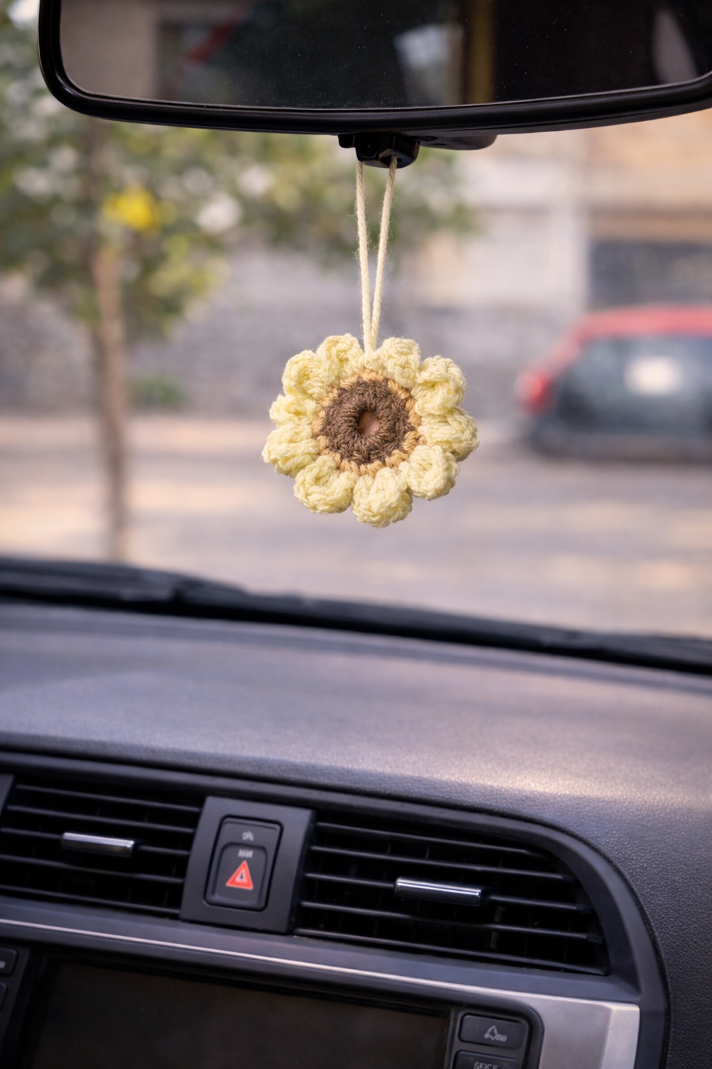 A charming handmade crochet car hanging ornament designed in a lovely flower shape with soft cream petals and a brown center. Lightweight, decorative, and perfect for adding a cozy handmade touch to your car interior.