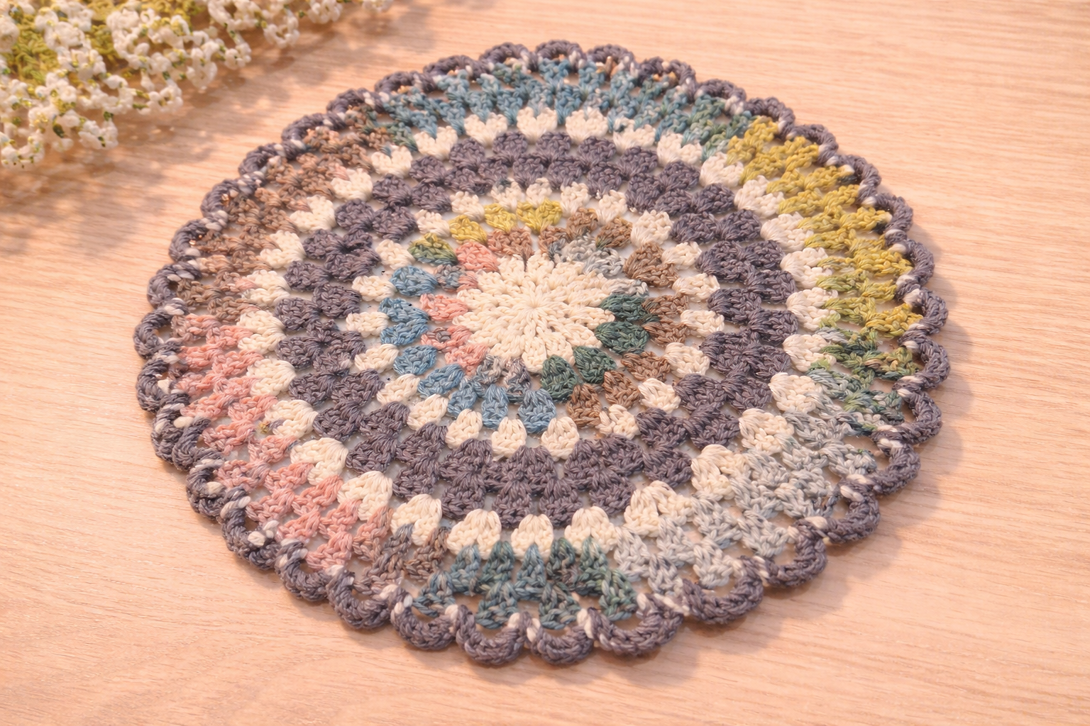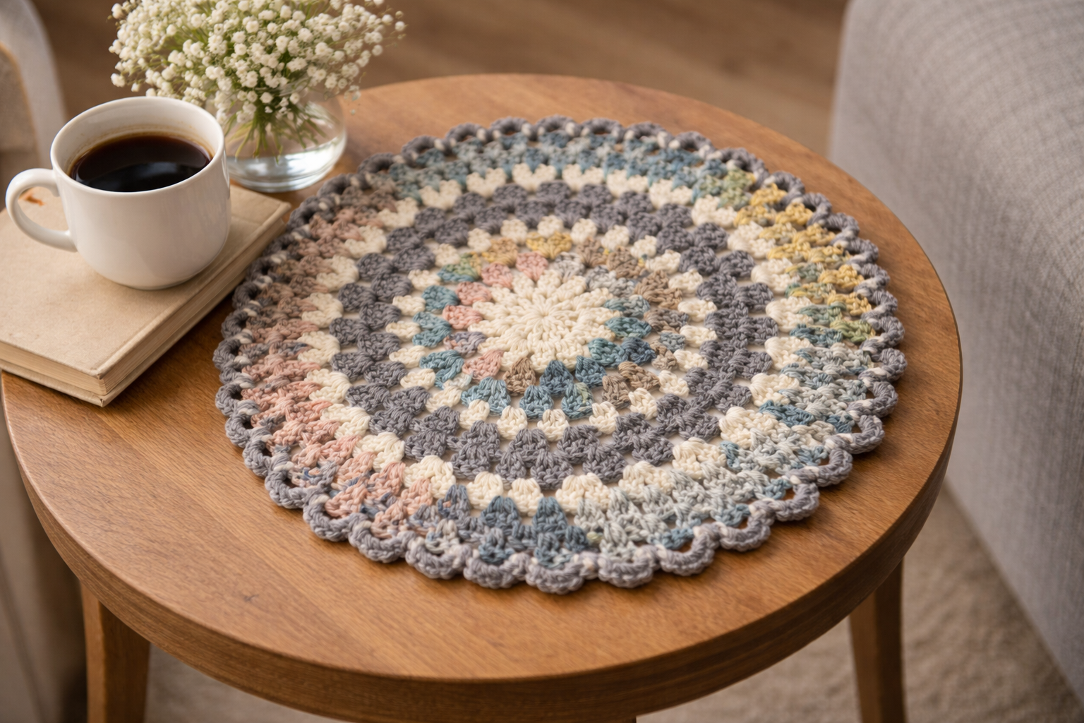 Featuring a lovely blend of cream, lavender, blue, pink, green, and soft earthy shades, this crochet table mat has a graceful and artistic look. The multicolor pattern gives it a warm handmade appeal that complements a variety of interior styles.