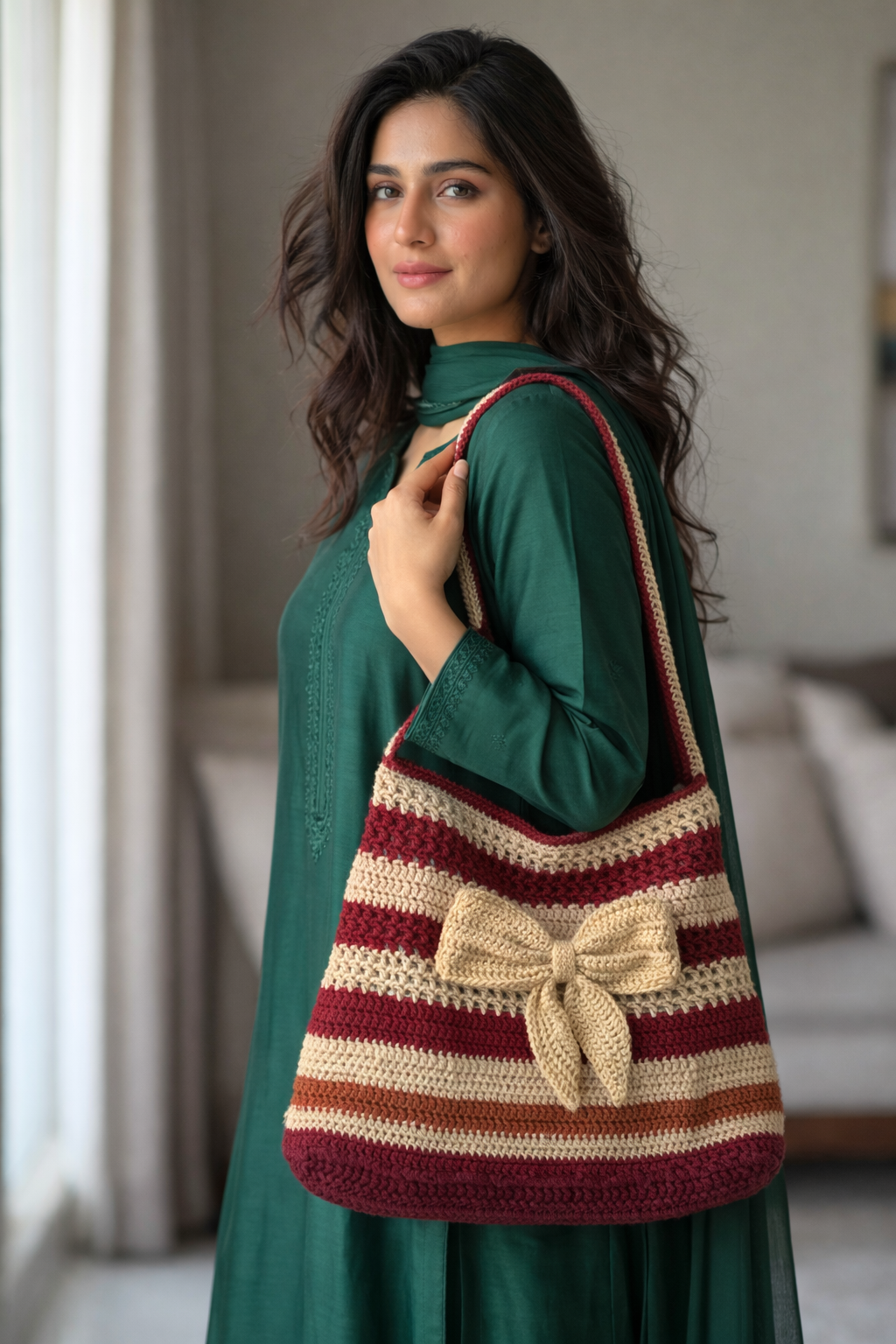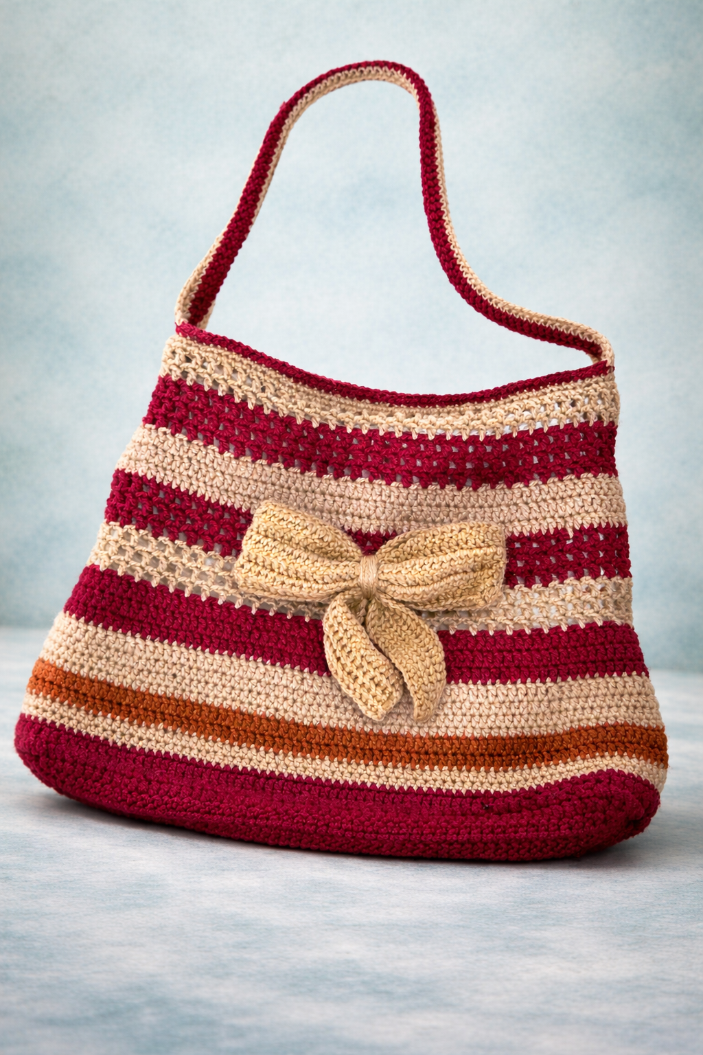 This handmade crochet shoulder bag is designed to combine everyday function with a charming artisanal look. Its striped pattern, soft structure, and beautiful bow detail create a unique accessory that stands out with elegance.