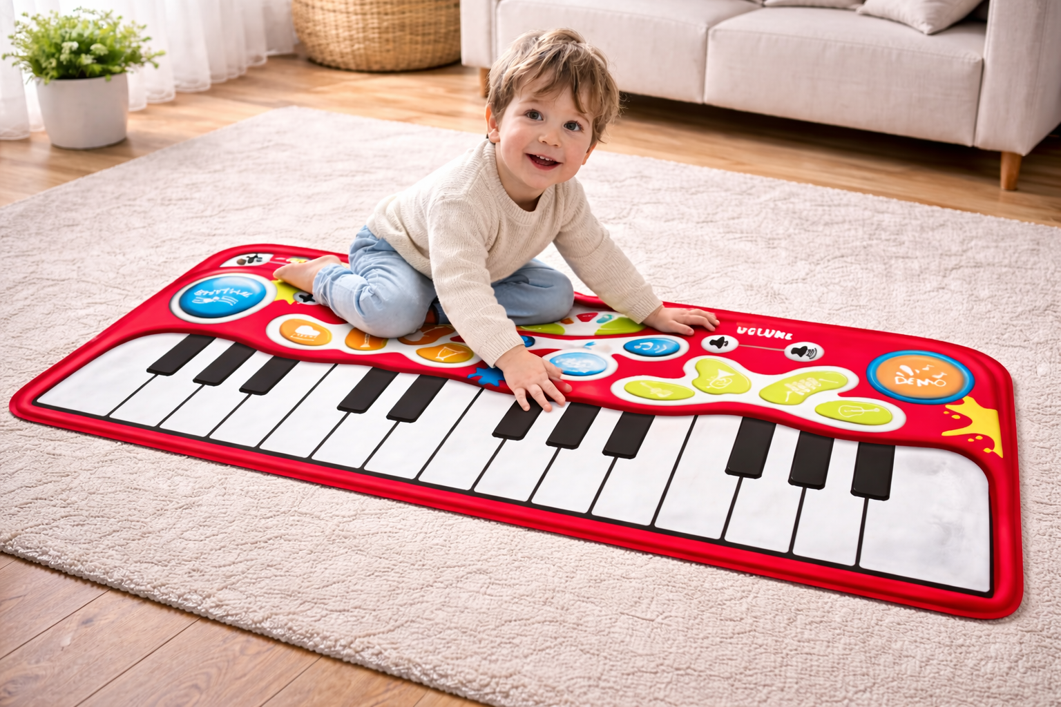 With its vibrant red finish, colorful function buttons, and eye-catching keyboard design, this musical mat creates an exciting visual appeal for kids. The playful look makes it a great addition to nurseries, playrooms, and indoor activity spaces.